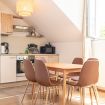 A dining table adds extra convenience, making it a welcoming spot for shared meals or working on tasks in a cozy atmosphere.