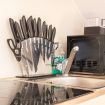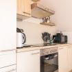 The apartment’s fully equipped kitchen is perfect for all your culinary needs. It includes an oven, stove, microwave, and essential cooking appliances, along with cutlery and utensils.