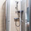 The ensuite bathroom is clean and functional, equipped with a walk-in shower, fresh towels, and all the essentials for a comfortable stay.