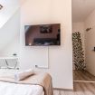 The room includes a standard double bed (140x200 cm) with fresh linens, a wall-mounted table for dining or laptop work, a large Smart TV, and air conditioning, perfect for relaxing after a day in the city.