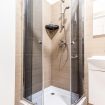 The ensuite bathroom is clean and functional, equipped with a walk-in shower, fresh towels, and all the essentials for a comfortable stay.