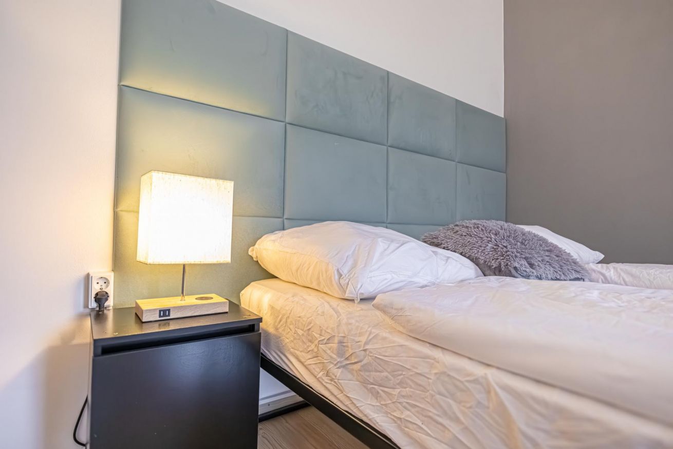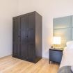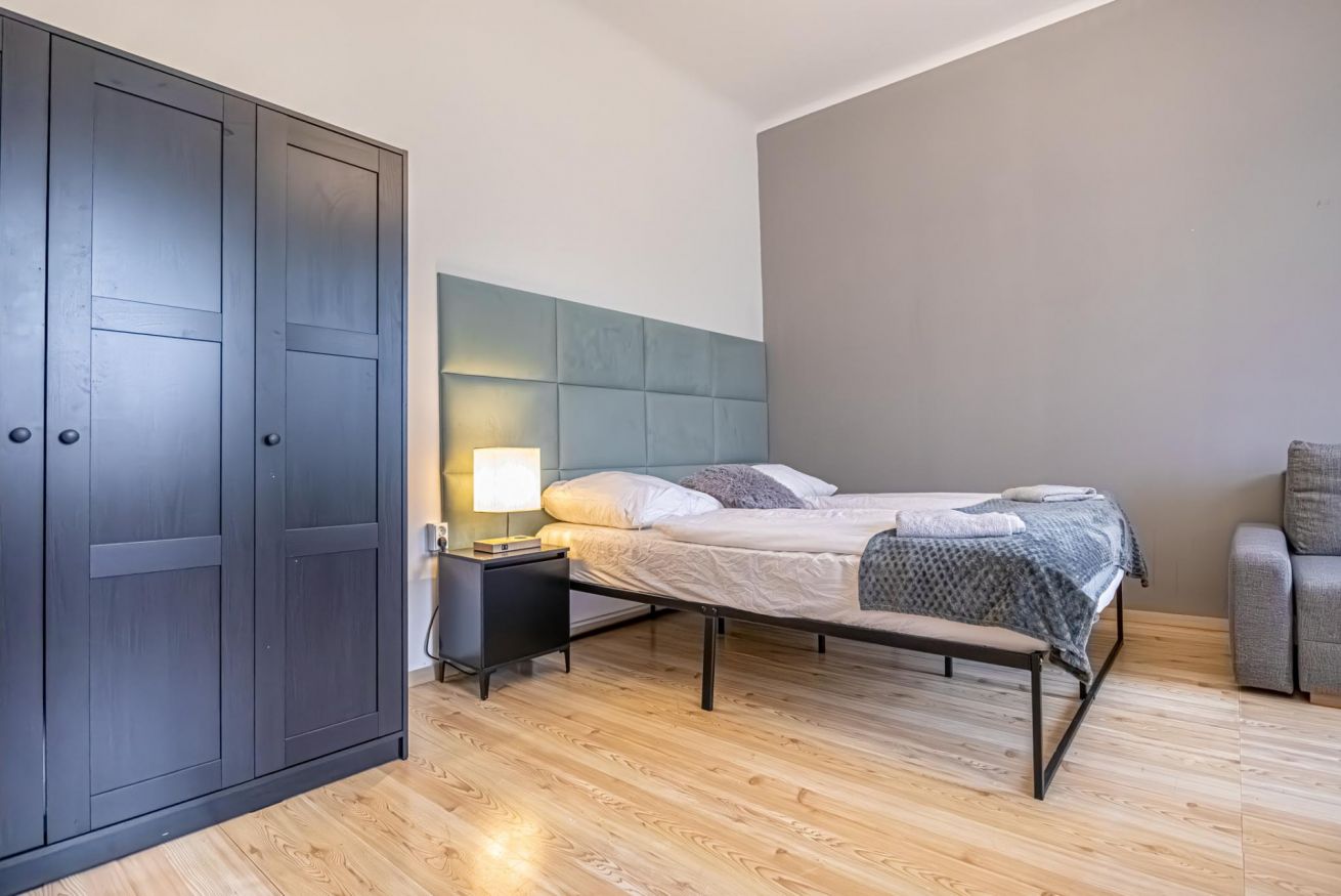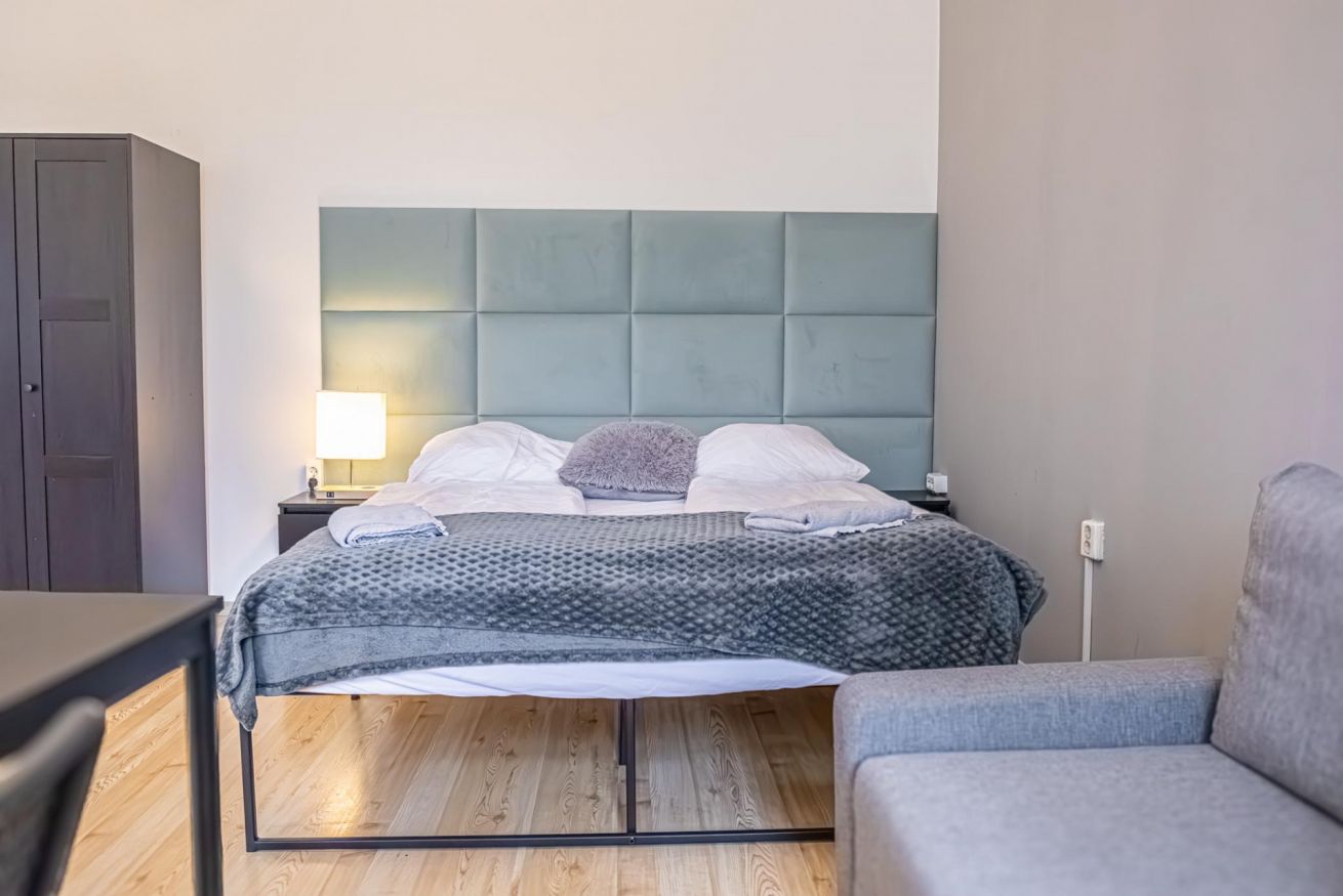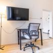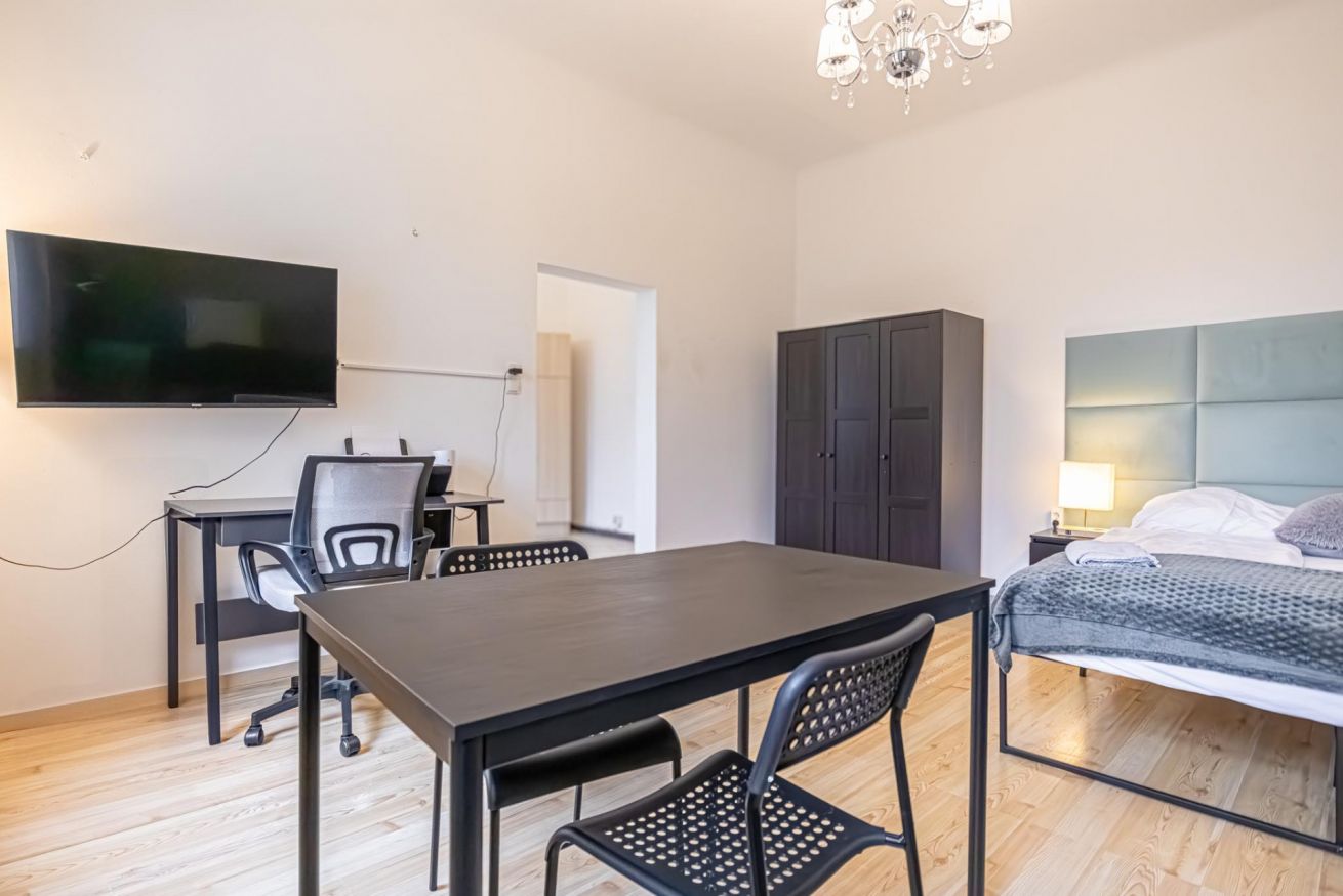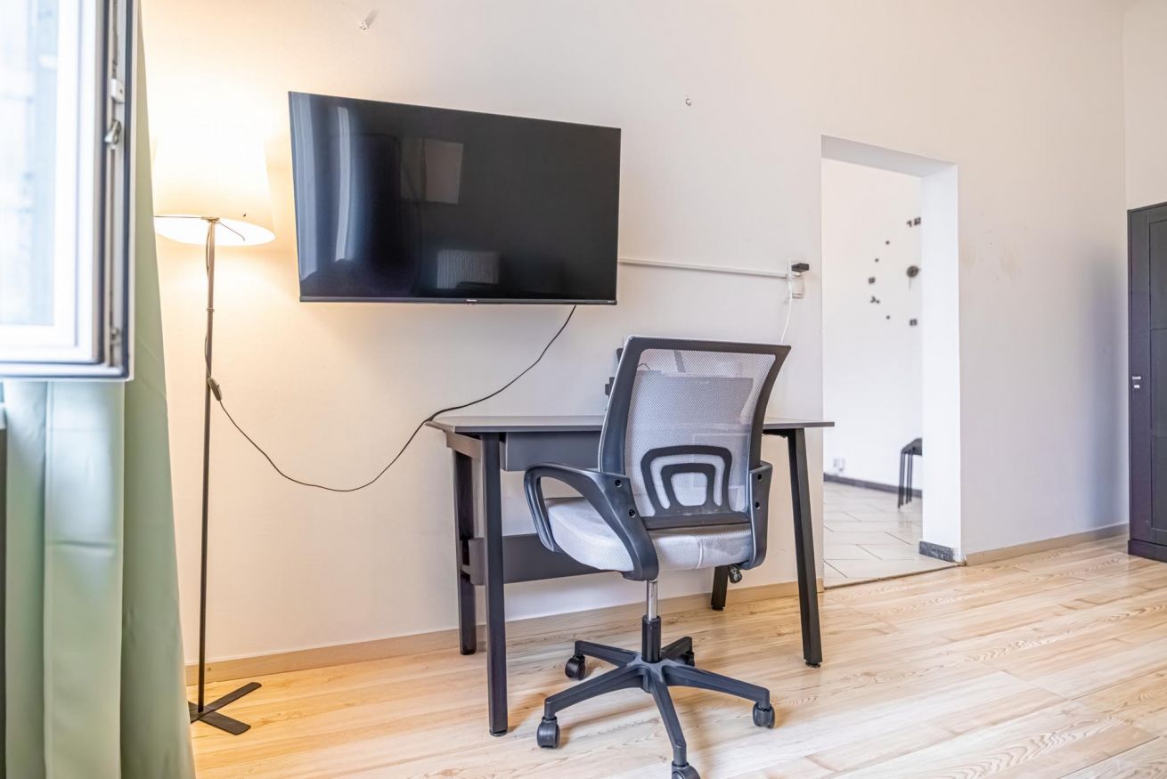 The bedroom features a queen-size bed (160x200 cm), a sofa bed, Smart TV, wardrobe, and a work desk with an ergonomic chair, ideal for working or studying. It accommodates up to 3 guests.