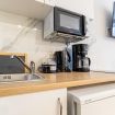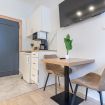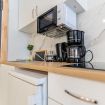 The studio comes with its own fully equipped kitchen, complete with a kettle, microwave, mini fridge, glasses, stove, cutlery, and a sink. There is also a small table with chairs for dining or working.