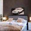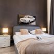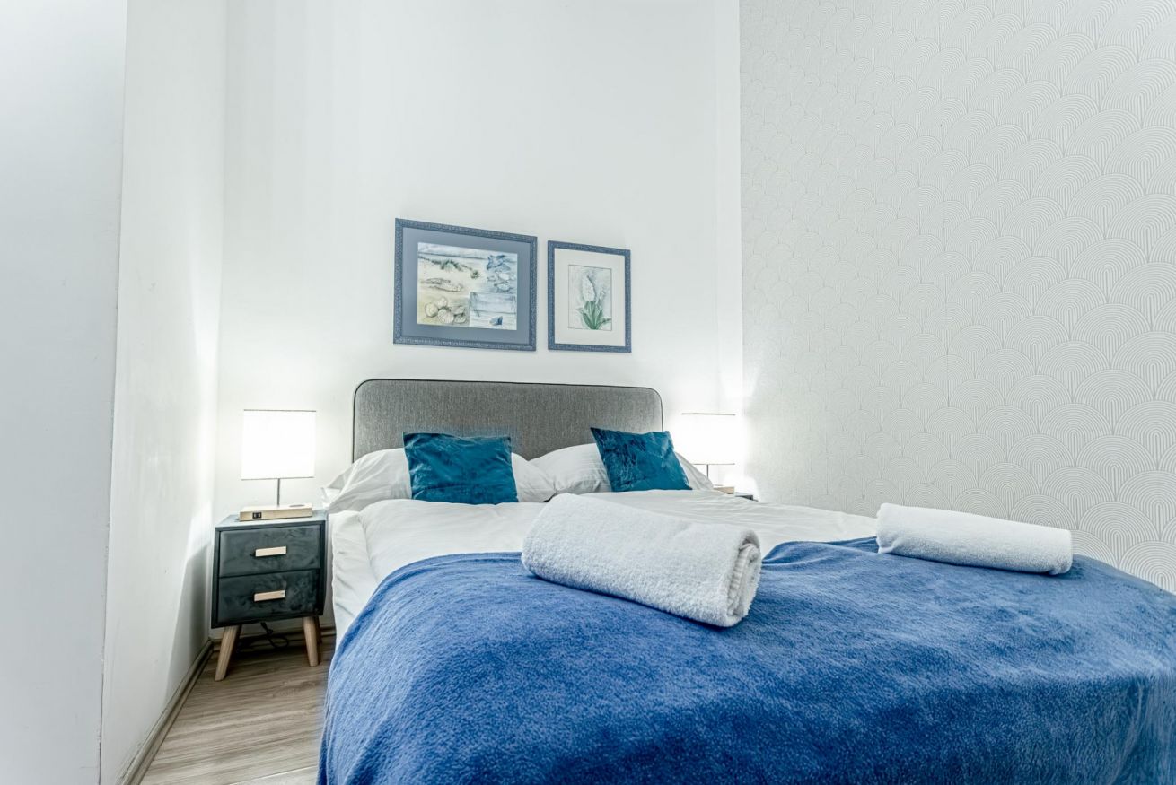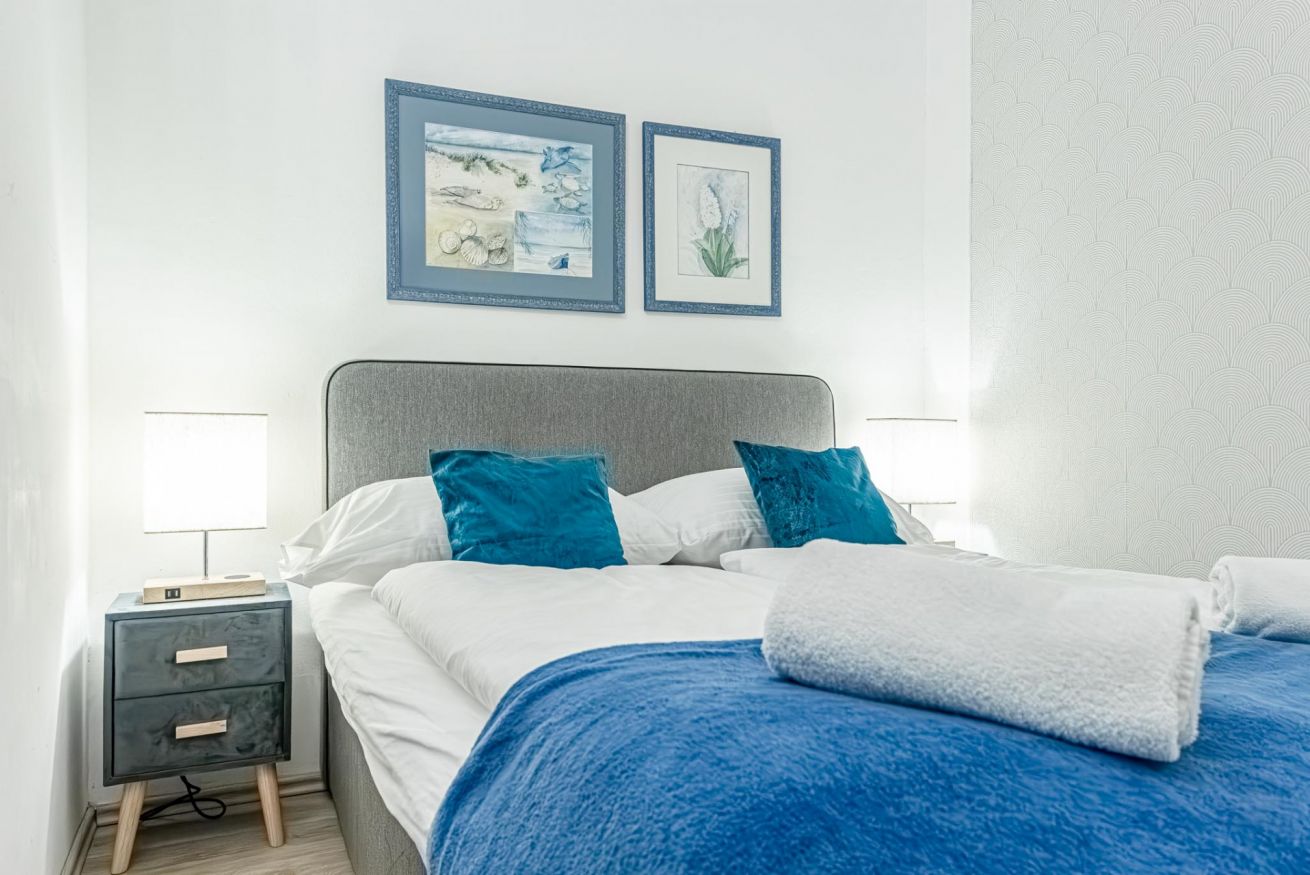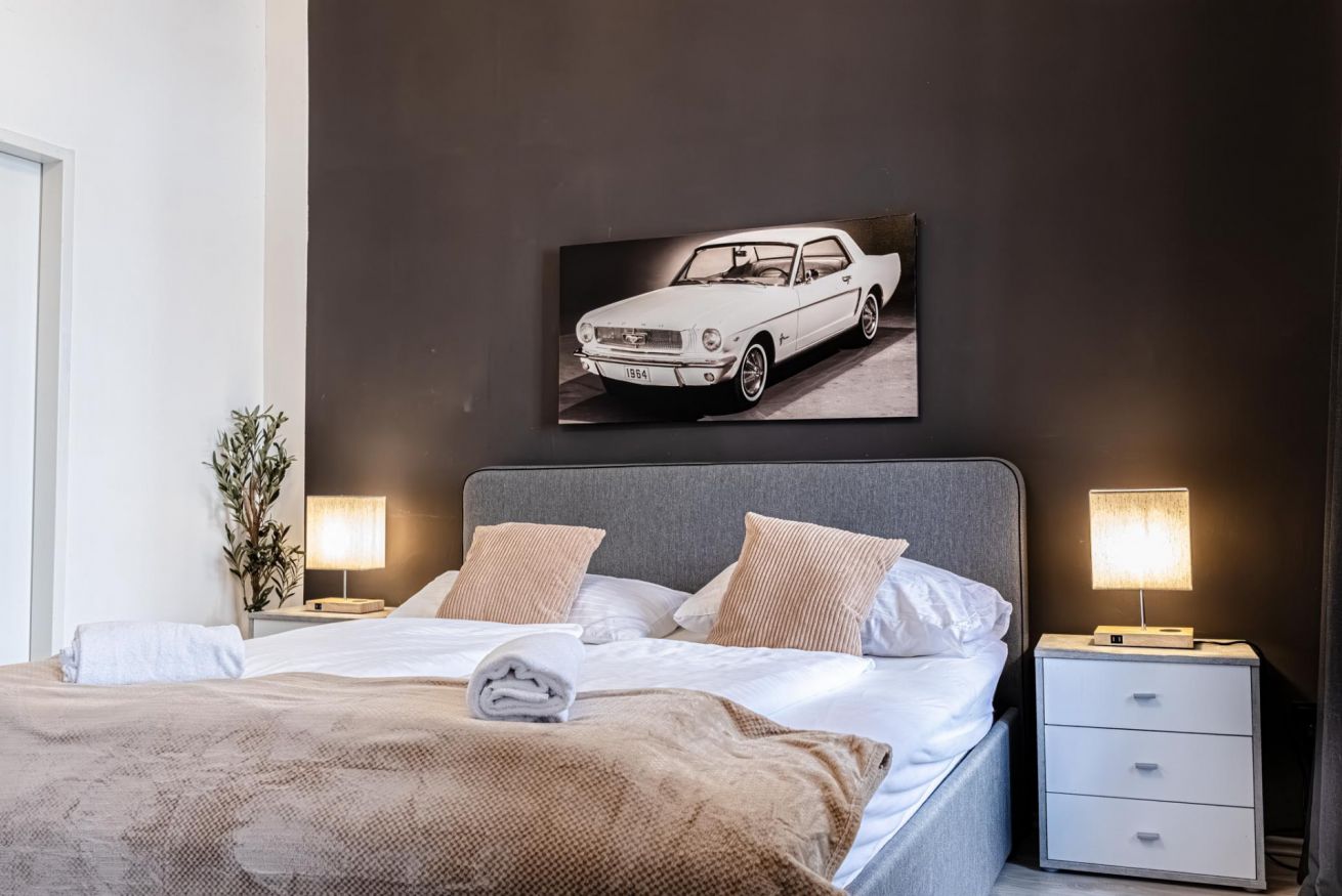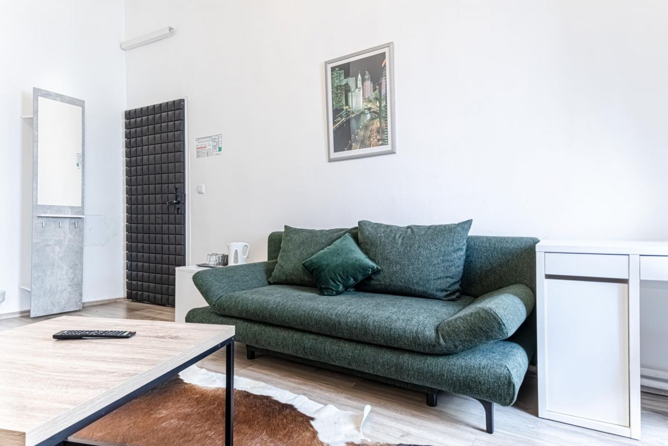 Room 1 features a king-size bed (180 × 200 cm) and a large sofa bed, accommodating up to 4 guests.