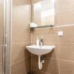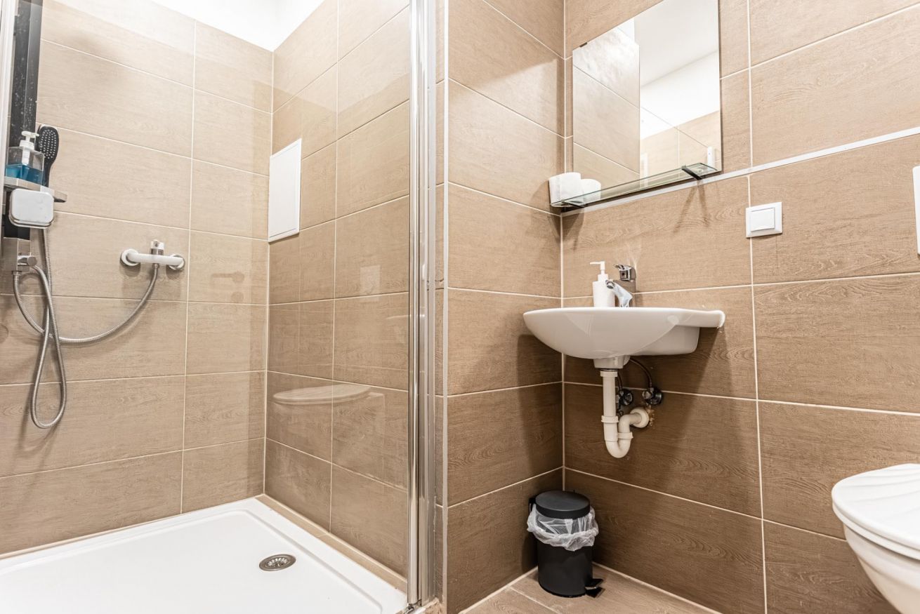 This group listing offers three private hotel rooms on the 1st floor (only stairs) in Vienna’s 6th district, just 350 m from Westbahnhof and a 2-minute walk from Zieglergasse Station. Covering 65 m² in total, the rooms accommodate up to 10 guests, each with a private bathroom. A shared lobby features coffee and beverage vending machines. No kitchen available.