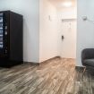 The shared lobby features coffee and beverage vending machines for guests to use.