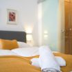 This bright hotel rooms setup offers comfortable accommodation with a total of nine standard double beds (140 × 200 cm), two sofa beds making it ideal for larger groups. Each room includes fresh linens, a wardrobe, chairs, and a sofa for added comfort.