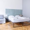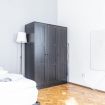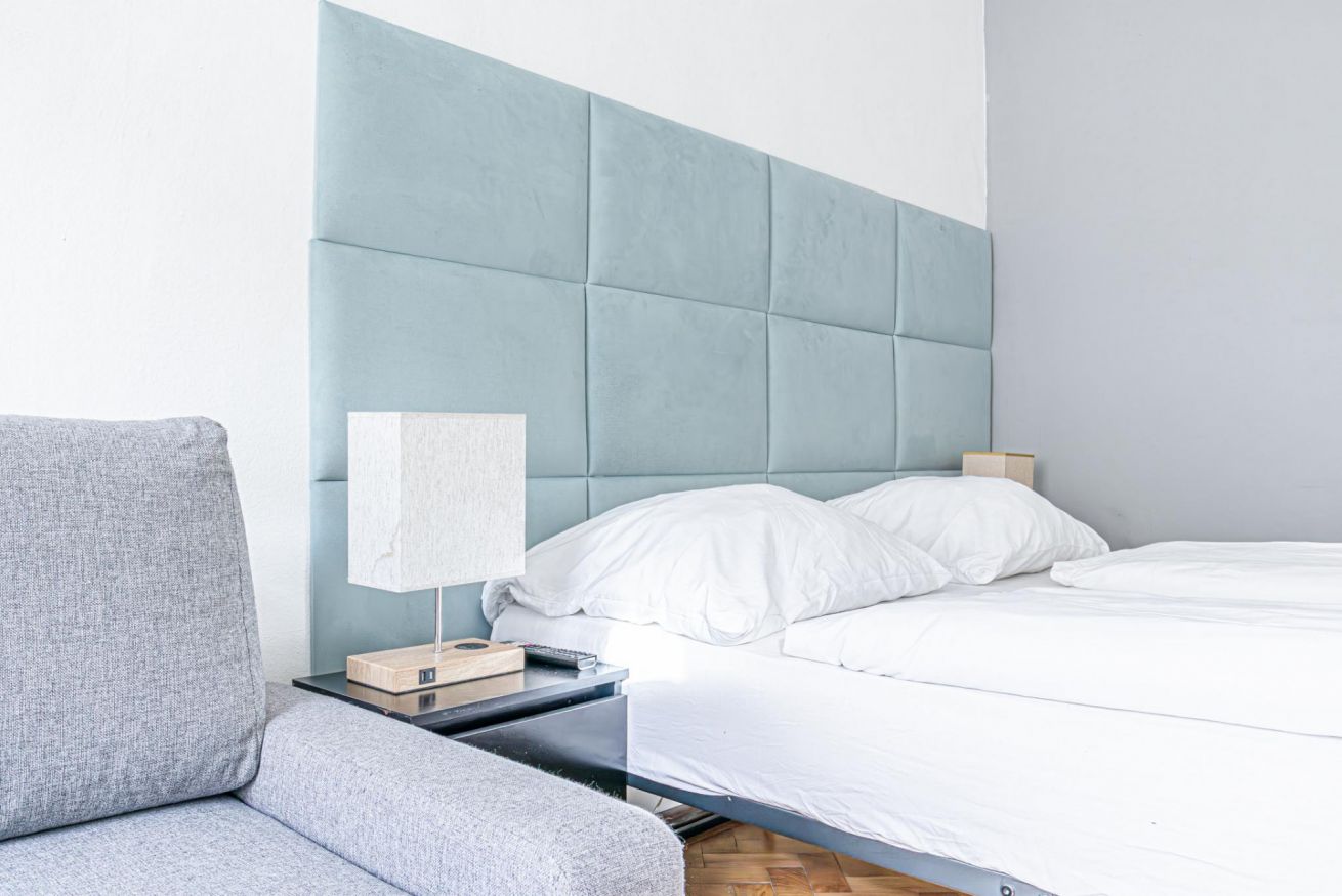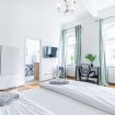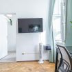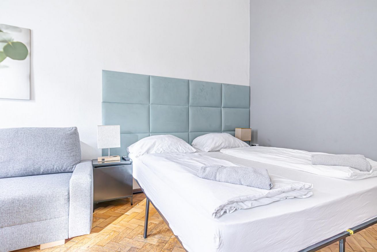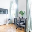 The bedroom includes a queen-size bed (160x200 cm), a sofa bed, Smart TV, wardrobe, and a work desk with an ergonomic chair, ideal for both relaxation and productivity. While there’s no separate living room, the room is designed for comfort and functionality.