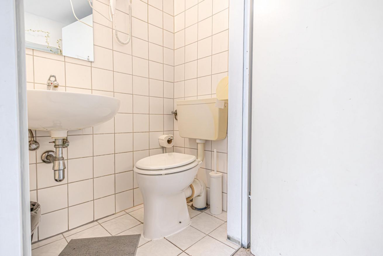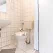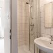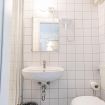 The private bathroom features a shower, toilet, and sink in one room. It's clean and functional, offering everything needed for a comfortable stay.